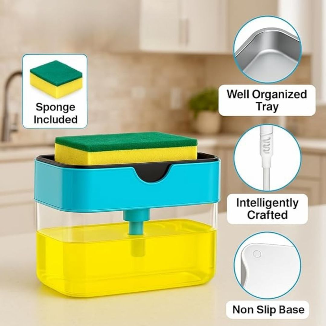 Streamline your kitchen or bathroom sink with this convenient 2-in-1 soap dispenser. This smart accessory combines a liquid soap dispenser and a dedicated sponge holder in a single, compact unit, helping you save valuable countertop space and keep your sink area tidy. The easy-to-use pump dispenses your favorite hand soap or dishwashing liquid with a simple press, and the built-in holder keeps your sponge or scrubber dry and within easy reach.